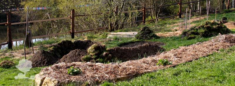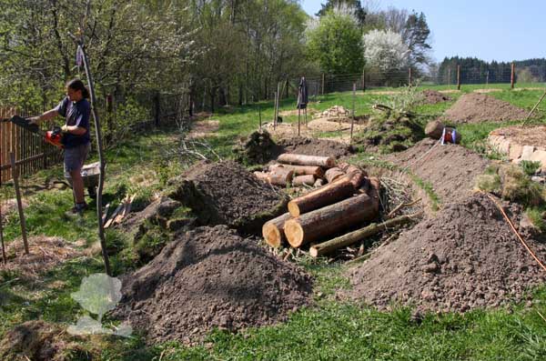 A je to! Jen Jirka s Tomem vykřikovali, že další vysoký záhon již ručně nebudují. Prý si mám objednat bagr a dostatek dřeva na výplň. Pravda je, že Sepp vysoké záhony na svém mnohahektarovém pozemku nebuduje ručně, ale za pomoci techniky.